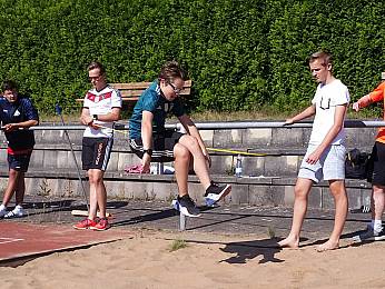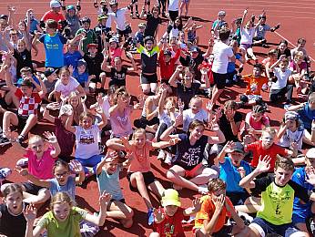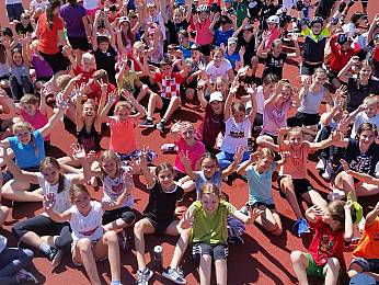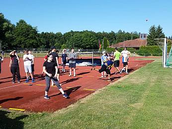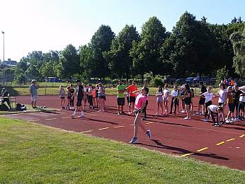 Um 8:00 Uhr trafen sich alle Fünft-und Sechstklässler, Riegenführer, Helfer und der Schulsanitätsdienst in der Bezirkssportanlage zur Begrüßung. Nach einem gemeinsamen Aufwärmen begann der erste Teil des Sporttages: die Bundesjugendspiele. In den Disziplinen 50m-Lauf, Weitsprung und Ballweitwurf konnten die Schülerinnen und Schüler sich messen und ein bisschen Wettkampferfahrung sammeln.