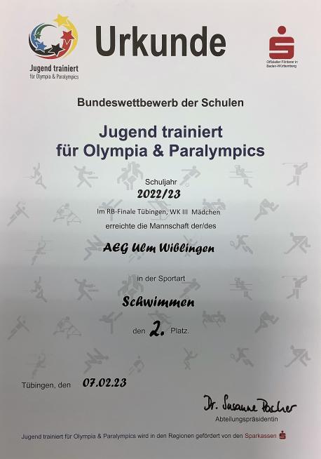 Dieses Jahr nahmen wir zum ersten Mal und als erste Ulmer Schule überhaupt am Wettkampf Jugend trainiert für Olympia Schwimmen (Wettkampfklasse 3) teil. In der Vorbereitung übten wir gemeinsam im Donaubad…. und das Training hat sich gelohnt! Wir konnten den 2. Platz im RB-Finale Tübingen im Ulmer Westbad erschwimmen. Jetzt gilt es, die Daumen zu drücken, da die besten Zweitplatzierten auch im Landesfinale Baden-Württemberg in Tübingen starten dürfen.