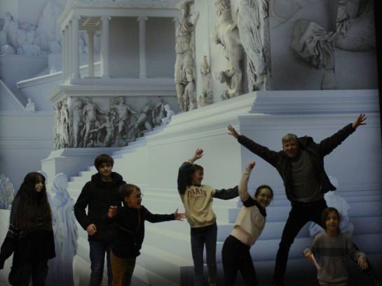 Dann ging es endlich in den Gasometer. Wir waren fasziniert von den Wandbildern mit Hunderten von Menschen in den Gassen, vor den Tempeln, im Theater. Alle zehn Minuten wechselte das Licht in gleicher Weise und simulierte so einen Tag-Nacht-Rhythmus, die Anschaulichkeit wurde durch akustische Effekte lebensecht verstärkt.