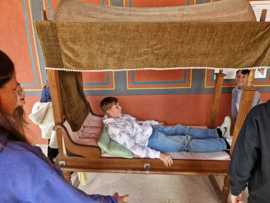 Ein weiteres Highlight der Führung waren die Latrinen, die uns auf humorvolle Weise den Spruch „Geschäfte machen“ näherbrachten. Auch der Schließmechanismus der Türen war ein Rätsel, das wir mit viel Begeisterung zu knacken versuchten. Manche durften sogar auf der Sänfte Platz nehmen und wurden von den Mitschülern standesgemäß getragen.
