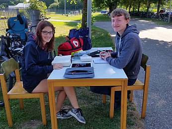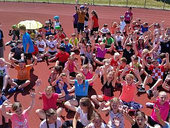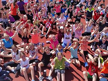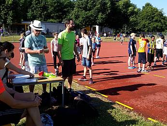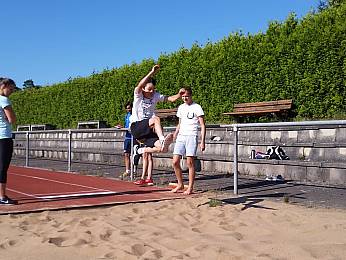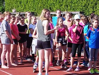 Um 8:00 Uhr trafen sich alle Fünft-und Sechstklässler, Riegenführer, Helfer und der Schulsanitätsdienst in der Bezirkssportanlage zur Begrüßung. Nach einem gemeinsamen Aufwärmen begann der erste Teil des Sporttages: die Bundesjugendspiele. In den Disziplinen 50m-Lauf, Weitsprung und Ballweitwurf konnten die Schülerinnen und Schüler sich messen und ein bisschen Wettkampferfahrung sammeln.