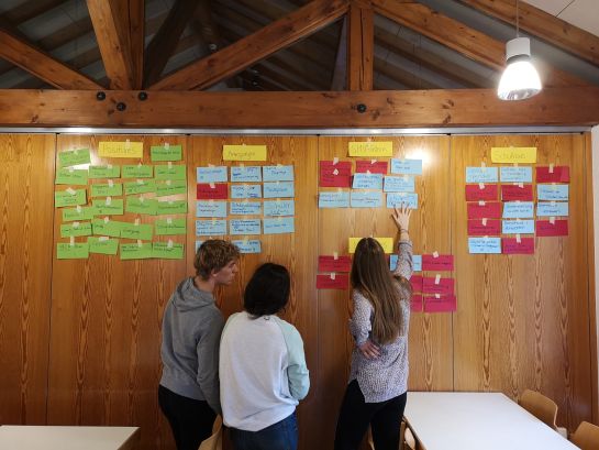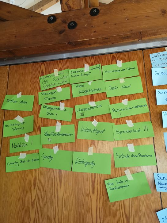Verbesserungsvorschläge, positive Aspekte und auch neue Ideen für unseren Schulalltag wurden in größeren Gruppen zusammengestellt, präsentiert und an der Steckwand zusammengefasst.