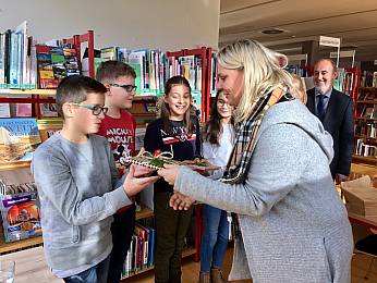 Die vierköpfige Jury, bestehend aus den Deutschlehrern Olaf Krischker und Anne Becker, sowie den beiden Bibliothekarinnen Frau Dittrich und Frau Rapsilber, war begeistert von der Souveränität, mit der alle Wettbewerbsteilnehmer die erste Runde meisterten. Jeder Kandidat stellte sich und das ausgewählte Buch kurz vor und musste dann drei Minuten aus einer vorbereiteten Stelle vorlesen. Dabei wurden Lesetechnik, Interpretation und Textauswahl bewertet. Die Jury lernte dabei ganz unterschiedliche Autoren und Geschichten kennen. Zwischen den einzelnen Beiträgen wurden die Teilnehmer liebevoll von Frau Stein, der Mitorganisatorin, im Vorbereitungsraum betreut, mit Nervennahrung versorgt und mit guter Laune motiviert. In einer zweiten Runde mussten die Schüler aus einem Fremdtext, Das Geheimnis von Hesterhill von Kristina Ohlsson, eine ihnen unbekannte Stelle vorlesen und mit Leben füllen. Auch diese Aufgabe meisterten alle wirklich überzeugend. Deshalb an dieser Stelle bereits ein großes Lob und Gratulation allen Teilnehmern, die als Klassensieger wirklich verdient gewonnen haben. Für ihre Leistung und Engagement bekamen alle fünf von der Jury ein Buchpräsent überreicht. Dieses Jahr entschieden wir uns für Der Tanz der Tiefseequalle von Stefanie Höfler, die bereits zweimal im Rahmen einer Autorenlesung zu Gast in unserer Schule war. Ihre Geschichte wird im Frühjahr 2020 im Theater Ulm auf die Bühne gebracht. Und trotzdem gab es am Ende einen Gesamtsieger: Alena Domic überzeugte durch ihre unglaublich sichere und angenehme Interpretation der Texte. Es war eine wahre Freude, ihr beim Lesen zuzuhören. Vielen Dank und herzlichen Glückwunsch, Alena! Alena wird unsere Schule im nächsten Frühjahr beim Regionalentscheid in Ulm vertreten. Wir drücken ihr die Daumen und stehen als Fanclub bereit! Anne Becker