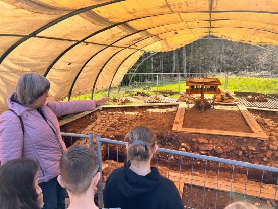 Auf dem Grabungsgelände angekommen, gingen alle erst in eine offene Hütte. Dort konnten sie ihr ganzes Gepäck ablegen. Dann teilten sich die Schülerinnen und Schüler in zwei Gruppen auf und bekamen eine Führung durch das Gelände.