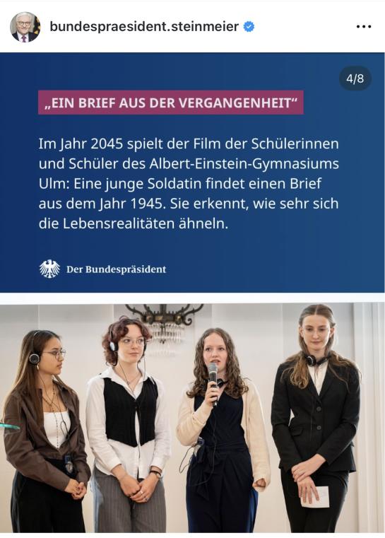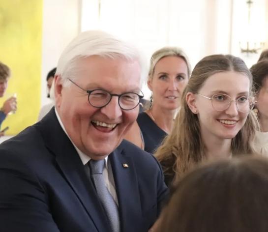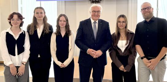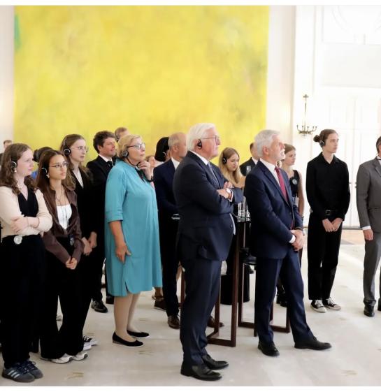 Großer Höhepunkt war die Einladung ins Schloss Bellevue. Dort wurden die Gewinnervideos unserem Bundespräsidenten Frank-Walter Steinmeier und dem tschechischen Präsidenten Petr Pavel durch die Schülerinnen präsentiert, um im Anschluss über die Gefahren erneuter Kriege und Möglichkeiten eines dauerhaften Friedens in Europa zu sprechen.