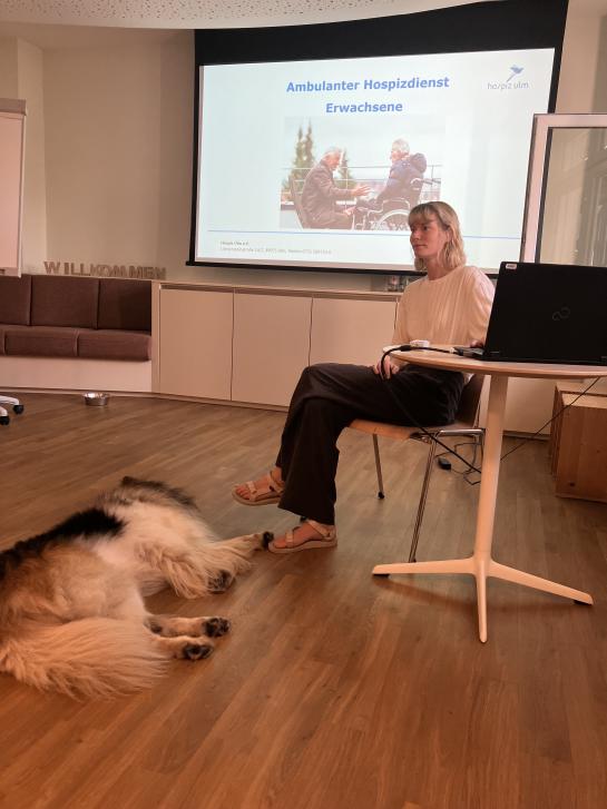Ein besonderer Schwerpunkt lag auf der Trauerbegleitung von Kindern, Jugendlichen und Erwachsenen – einem Angebot, das das Hospiz unentgeltlich zur Verfügung stellt. Frau Scheben berichtete dabei nicht nur informativ und einfühlsam, sondern wurde auch von ihrem Hund begleitet, der sie in ihrer Arbeit unterstützt und auf dem Fotos zu sehen ist.