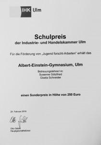 Außerdem erhielt das Albert-Einstein-Gymnasium einen Schulpreis der Industrie- und Handelskammer Ulm im Wert von 250 €.